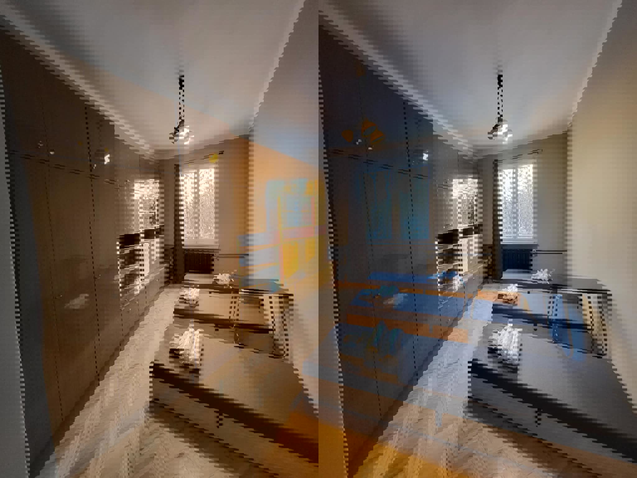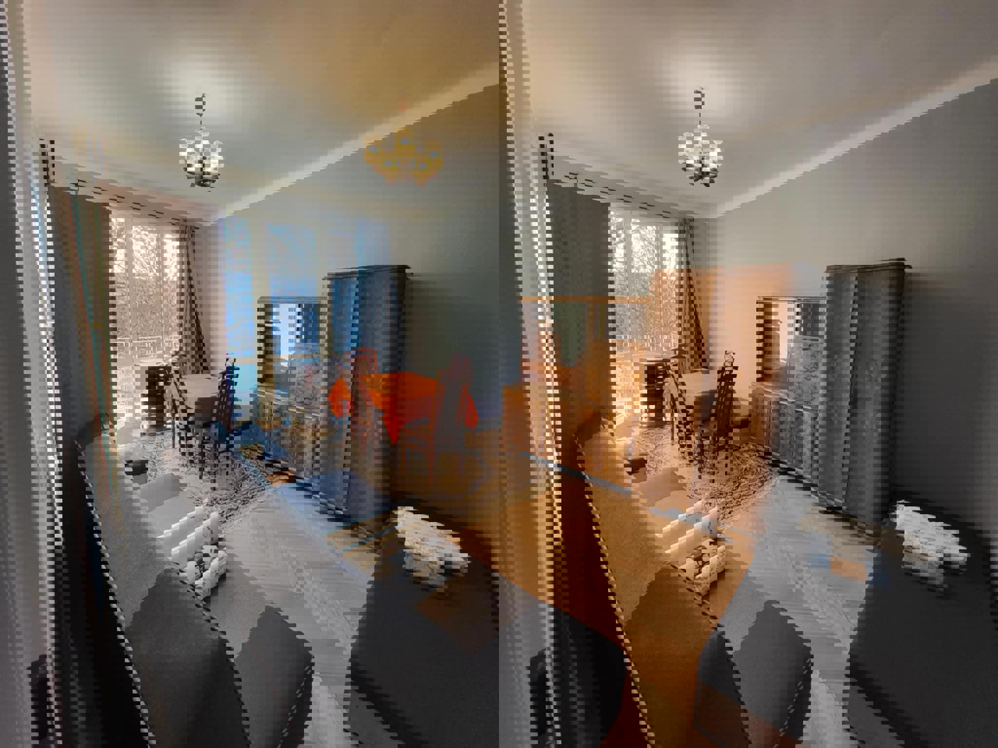 Oferujemy przytulną i w pełni umeblowaną kwaterę pracowniczą idealną dla grup pracowników lub ekip budowlanych. Pokój jest jasny, czysty i funkcjonalny – wyposażony w trzy solidne drewniane łóżka piętrowe, wygodne materace, pościel oraz pojemne szafy i regały na ubrania.