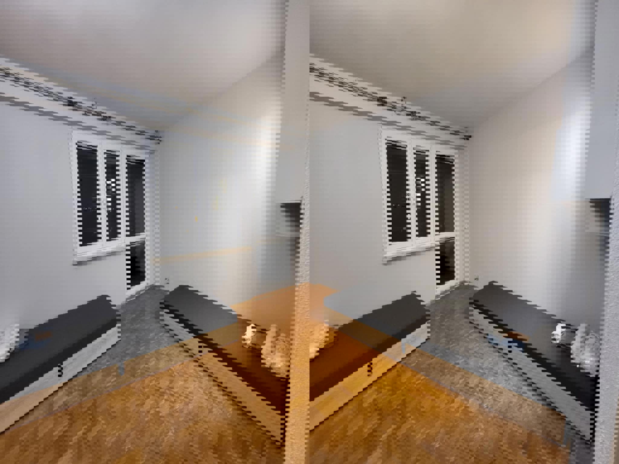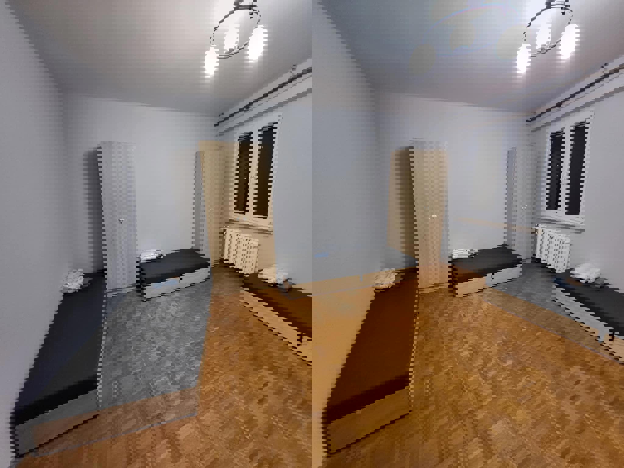 Oferujemy przytulną i w pełni umeblowaną kwaterę pracowniczą idealną dla grup pracowników lub ekip budowlanych. Pokój jest jasny, czysty i funkcjonalny – wyposażony w trzy solidne drewniane łóżka piętrowe, wygodne materace, pościel oraz pojemne szafy i regały na ubrania.