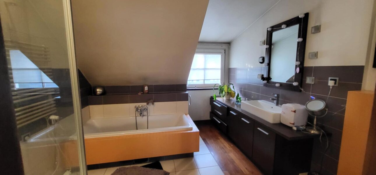 Do dyspozycji lokatorów są również stół z krzesłami, miejsce do odpoczynku oraz nowoczesne oświetlenie gwarantujące komfort po całym dniu pracy. Pomieszczenie posiada okno dachowe i okno boczne, co zapewnia dostęp do naturalnego światła przez cały dzień.