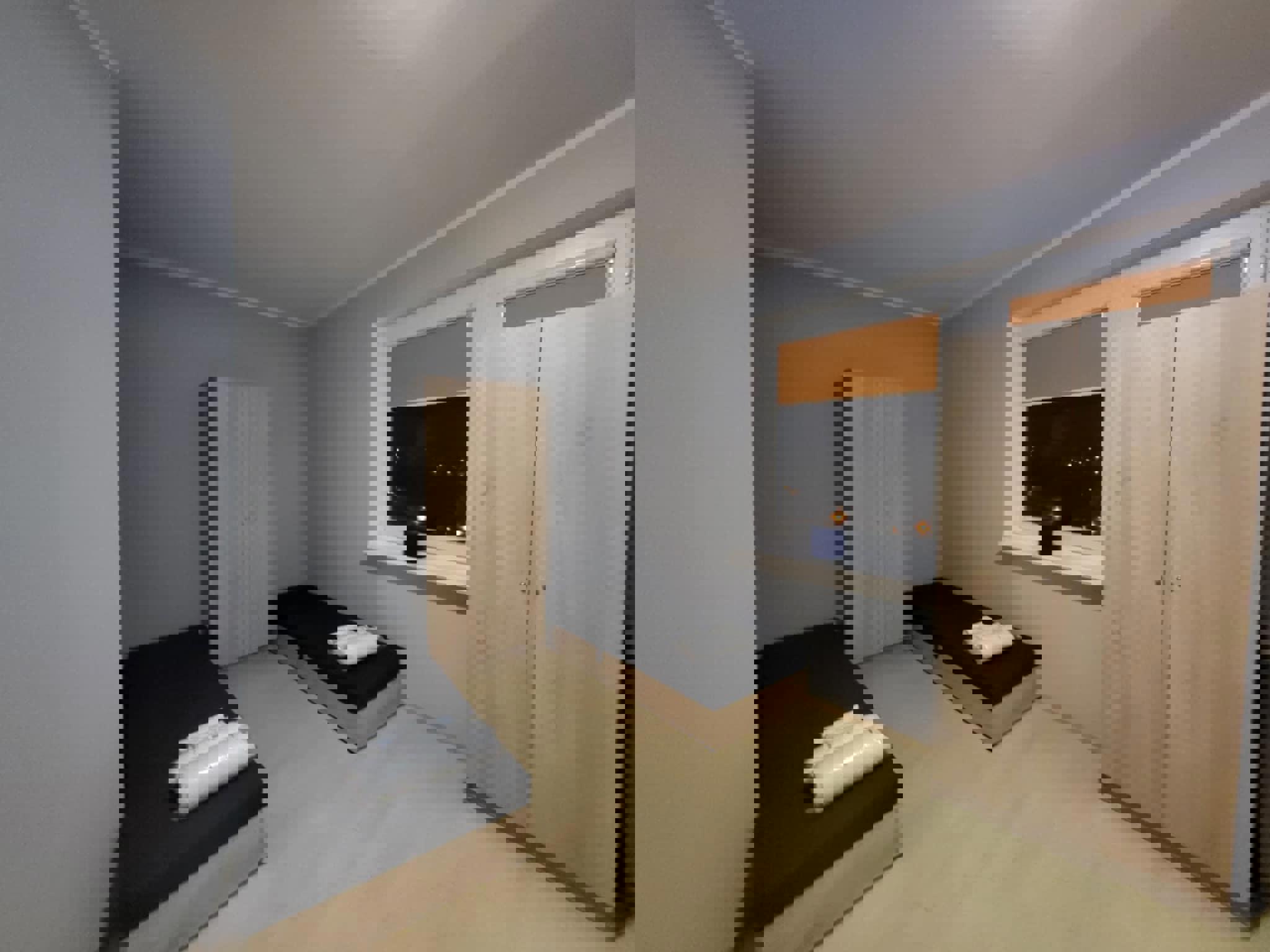 Oferujemy przytulną i w pełni umeblowaną kwaterę pracowniczą idealną dla grup pracowników lub ekip budowlanych. Pokój jest jasny, czysty i funkcjonalny – wyposażony w trzy solidne drewniane łóżka piętrowe, wygodne materace, pościel oraz pojemne szafy i regały na ubrania.