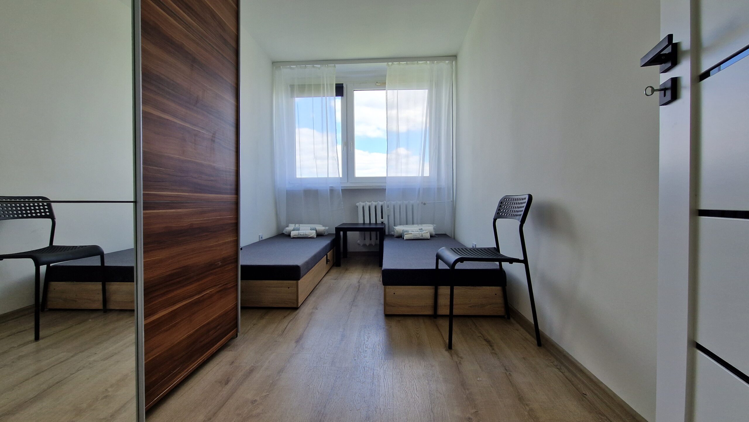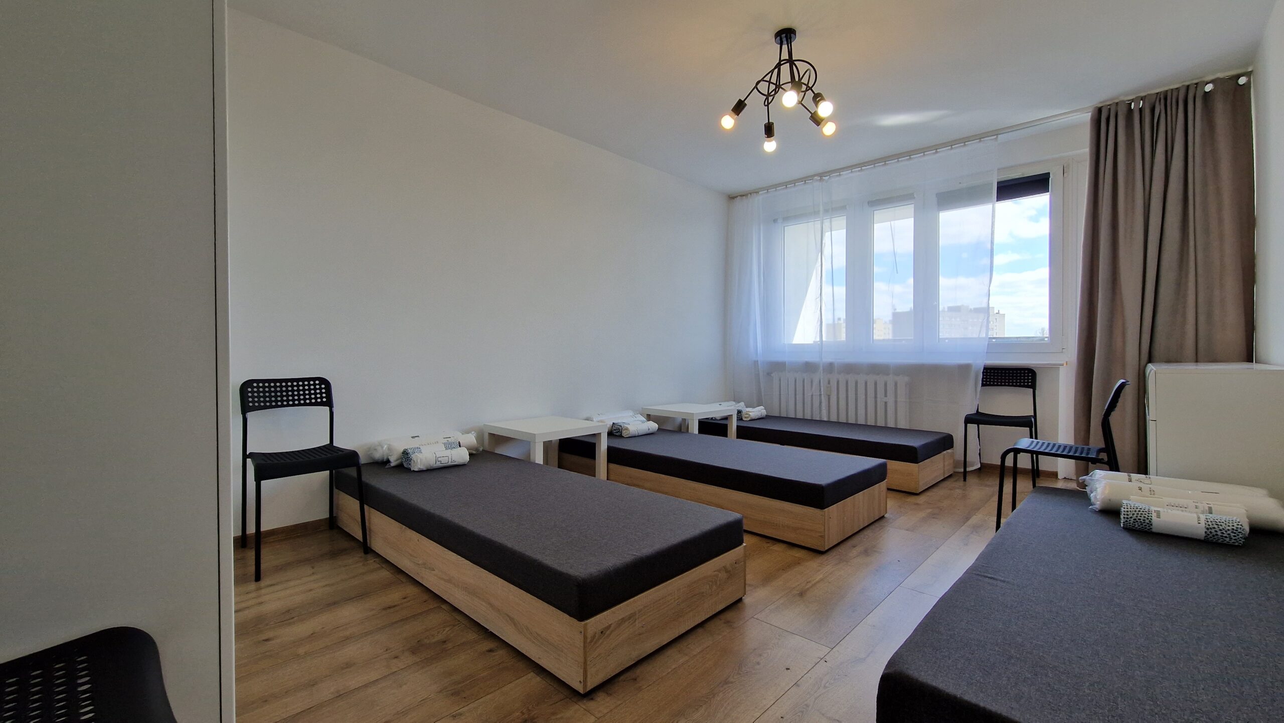 Oferujemy przytulną i w pełni umeblowaną kwaterę pracowniczą idealną dla grup pracowników lub ekip budowlanych. Pokój jest jasny, czysty i funkcjonalny – wyposażony w trzy solidne drewniane łóżka piętrowe, wygodne materace, pościel oraz pojemne szafy i regały na ubrania.